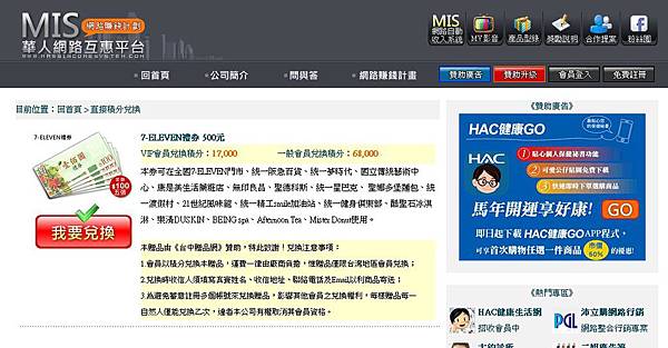 MIS網路自動收入系統的免費會員雖然不像VIP付費會員可以累積積分換現金,但他可以用積分兌換商品、刊登廣告或是兌換7-11禮卷500元。
